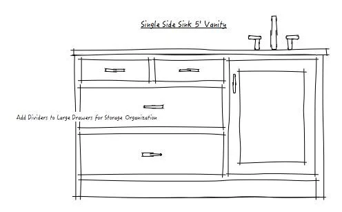 INCREASE STORAGE AND COUNTER SPACE: I designed 3 different examples of 5' vanities with a single sink. The theme - drawer storage is king. In addition you will gain 21" of counter space - awe the thought of more flat counter space to spread out the goodies and then have a place for them to go!